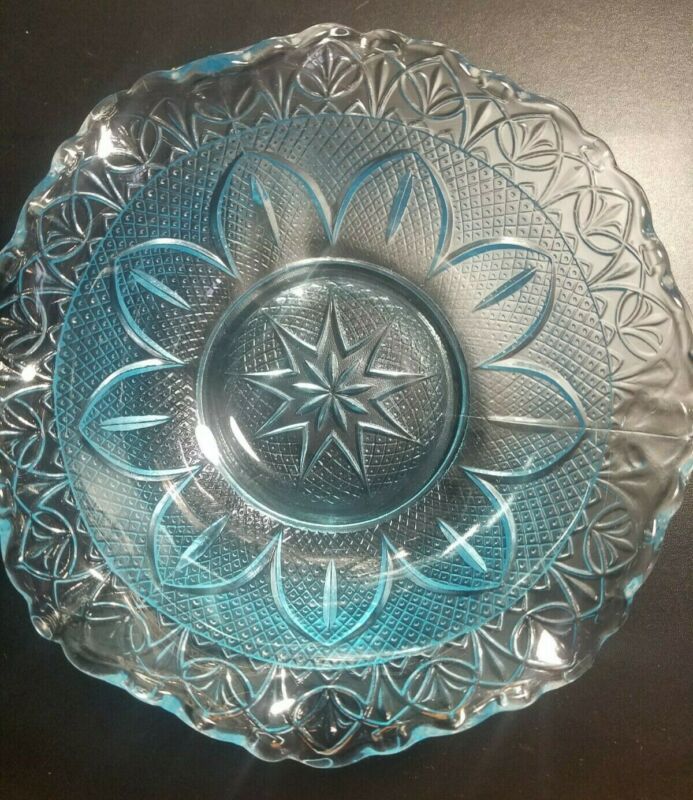 Title (ebay affiliate link): Vintage Depression Ice Blue Teal Aqua Pressed Glass Bowl Ruffle Edge Star Burst