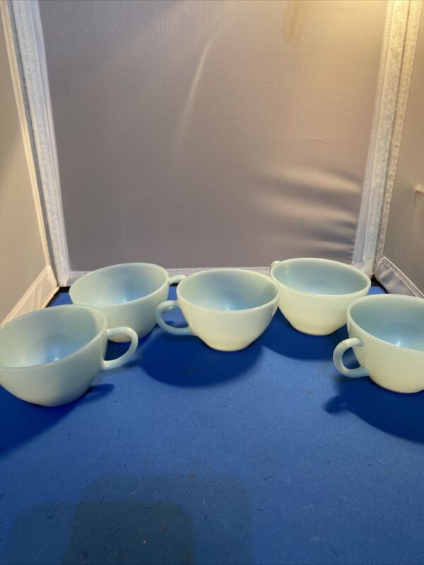 Title (ebay affiliate link): 5 VINTAGE FIRE KING BLUE COFFEE CUP USA OVEN WARE DINNERWARE. Azurite?