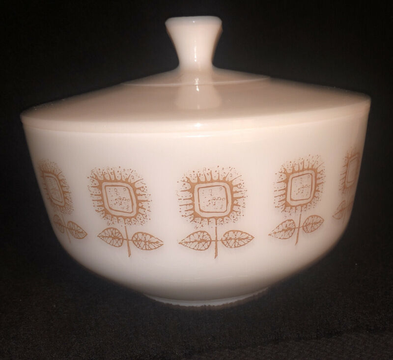 Title (ebay affiliate link): Vintage Federal Glass Covered Bowl 2.5 Quart White Brown Sunflower Pattern Lid