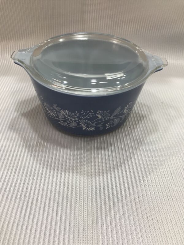 Pristine Vintage Blue Pyrex Colonial Mist White Daisy #473B 1L Bowl & Lid