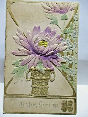 Title (ebay affiliate link): 1910 EMBOSSED POSTCARD BIRTHDAY GREETINGS, GOLD BASKET OF LARGE PURPLE FLOWERS