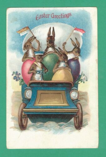 VINTAGE EASTER POSTCARD RABBITS RIDE IN CAR WITH BIG COLORED EGGS FLAGS