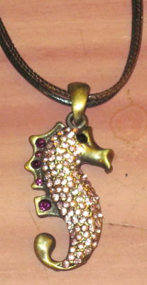 Title (ebay affiliate link): Antique Gold Seahorse necklace with Purple rhinestones