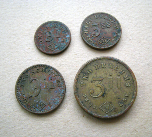 scarce! 4 old DRUG STORE / PHARMACY brass tokens scale weights DRACHMS, SCRUPLES