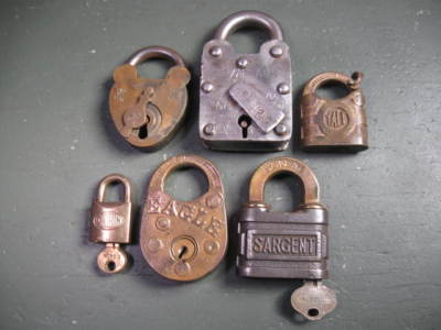 ANTIQUE OLD VINTAGE TOOLS PADLOCKS GROUP SOME BRASS
