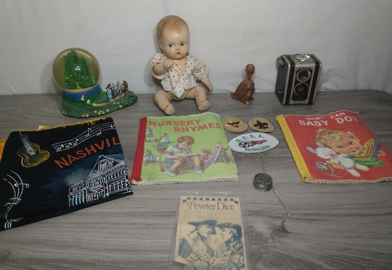 Vintage Junk Drawer Lot Paper Doll Cloth Books Pewter Dice Wizard of Oz Ear Ring