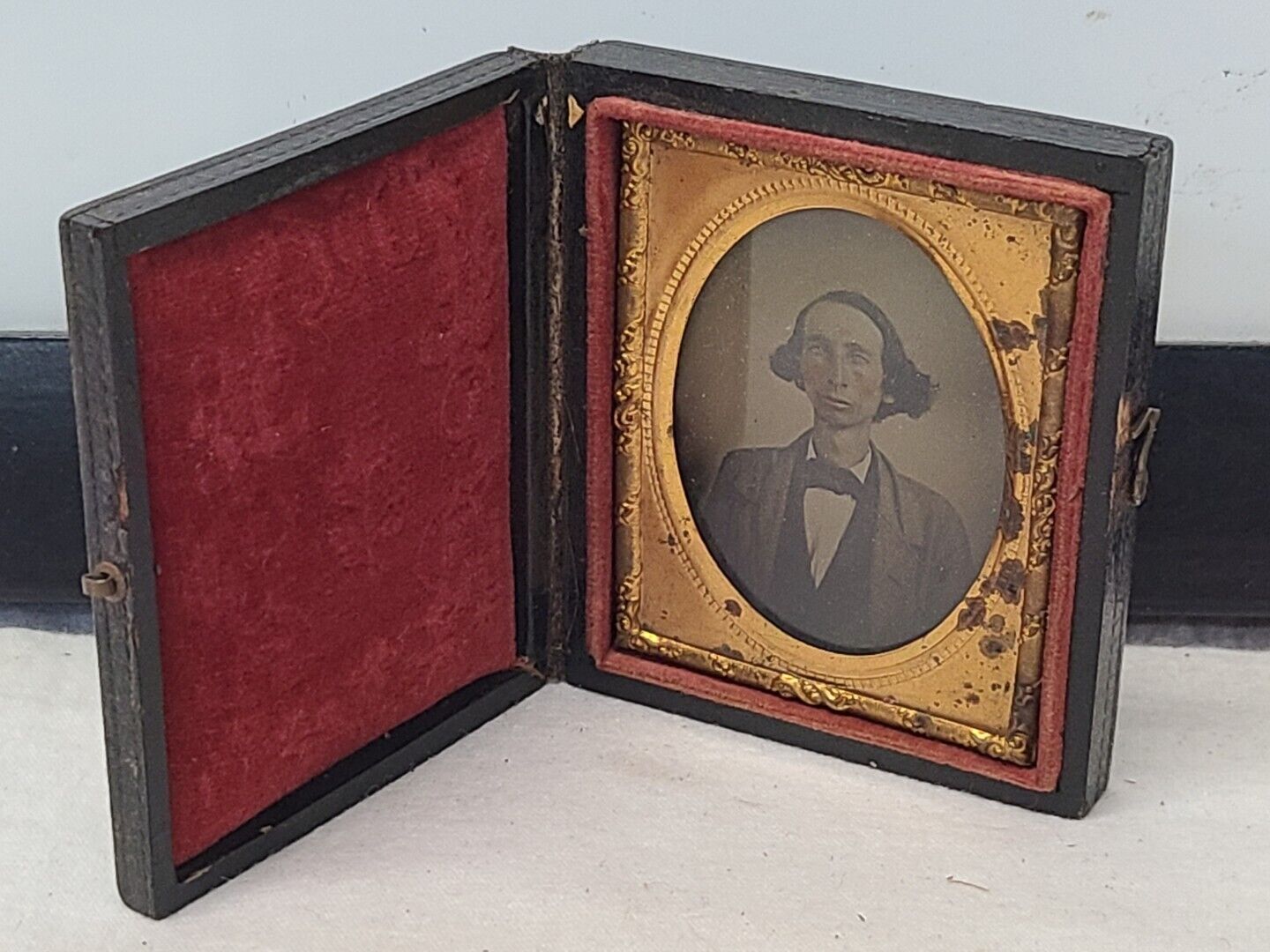 Title (ebay affiliate link): Antique Ambrotype Photograph Young Male in Coat Vest Cravat Unusual Hairstyle