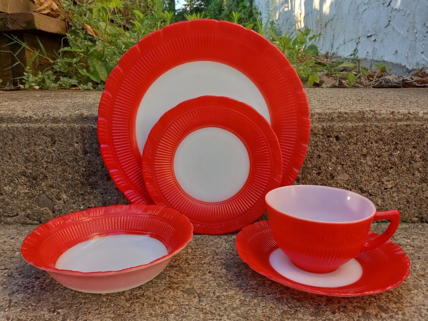 Title (ebay affiliate link): 5 Piece Set MacBethEvans Petalware Cremax Primary Red dinner Cup bowl saucer