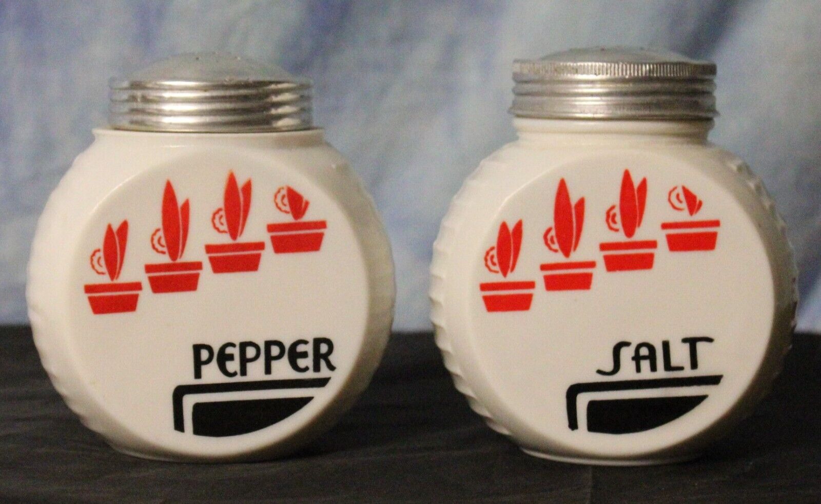 Title (ebay affiliate link): Fire King Red Flower Pot Vitrock Milk Glass Salt Pepper Shakers