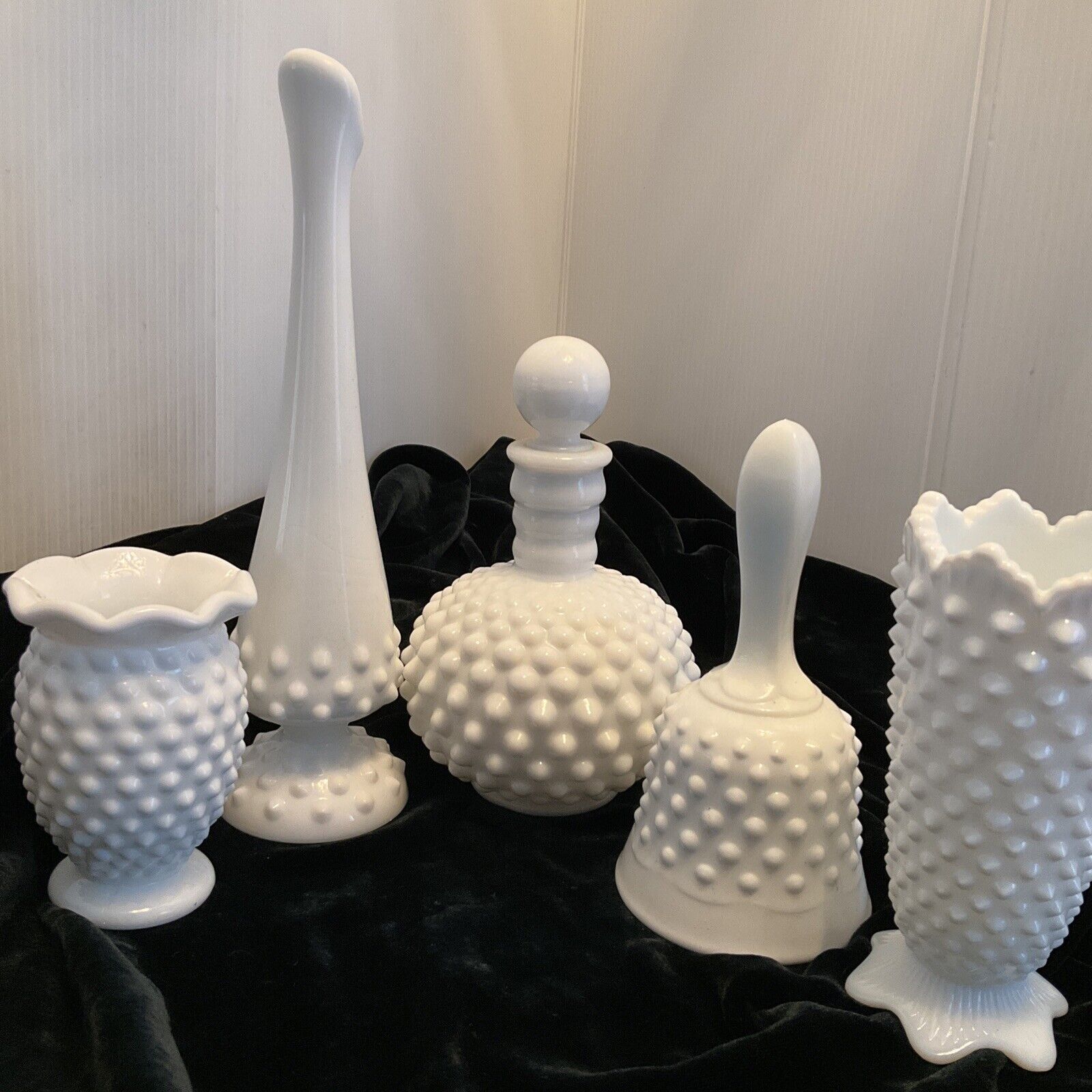 Title (ebay affiliate link): VINTAGE LOT OF 5 FENTON HOBNAIL MILK GLASS PIECES 3 vases 1 Bottle 1 Bell