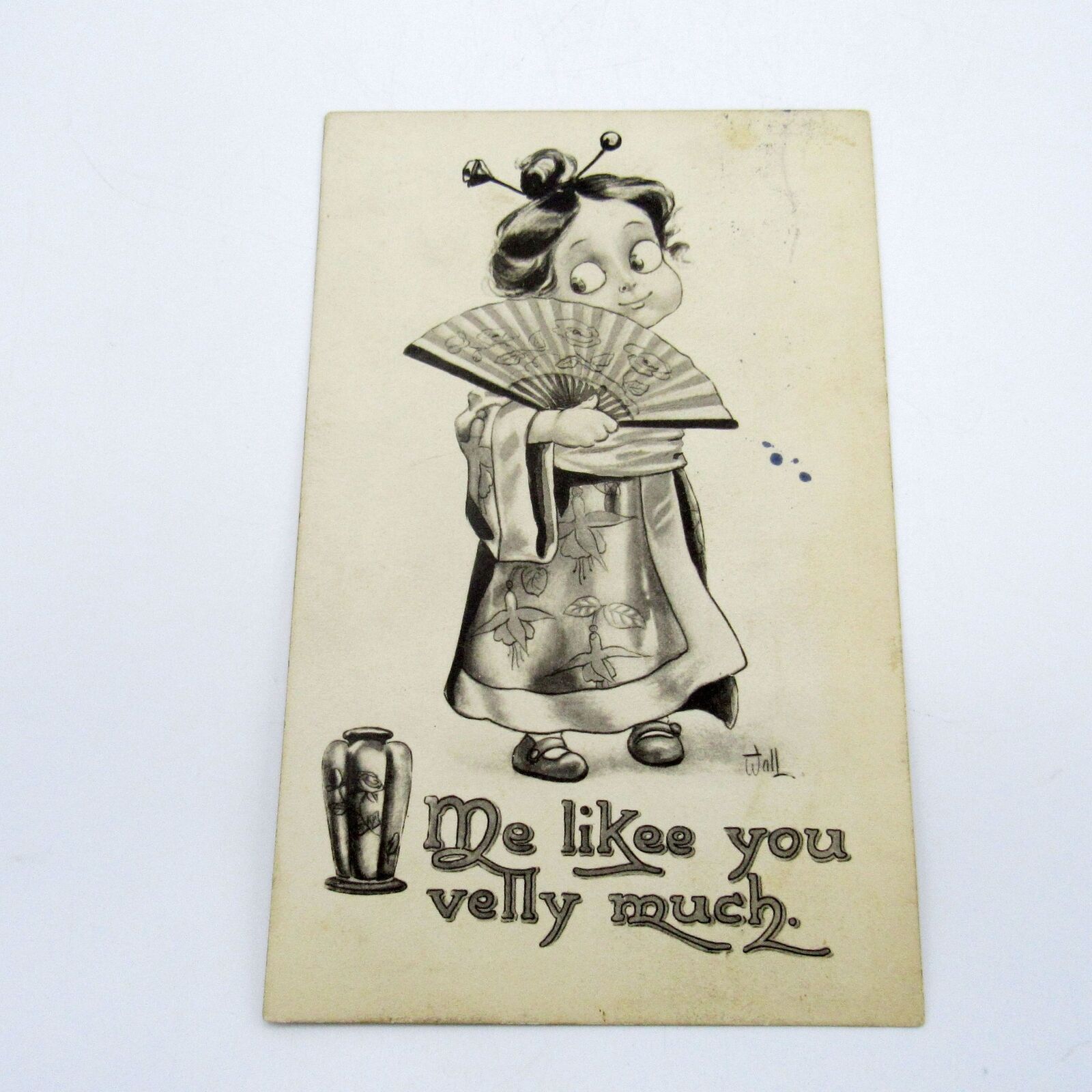 Title (ebay affiliate link): Antique Postcard 34Me Likee You Velly Much34 Asian Young Girl Post Card Hat Hatpin