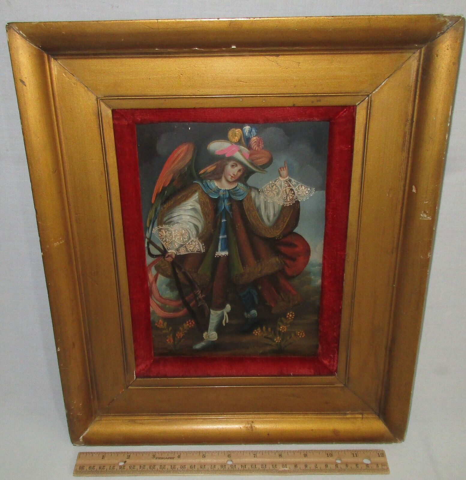 Antique 19th C Spanish Colonial Retablo Icon Religious Painting on Tin Saint
