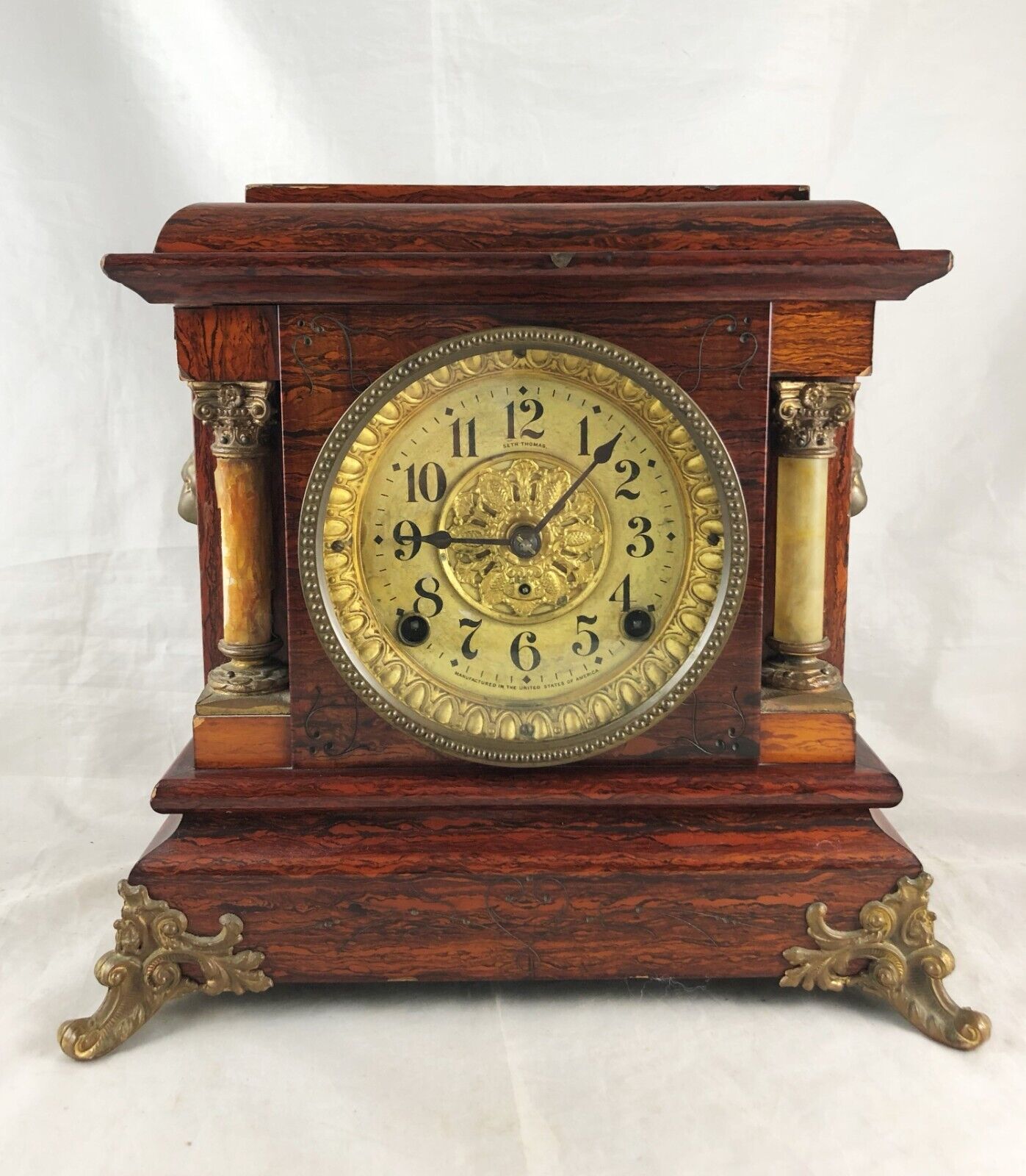 Title (ebay affiliate link): Antique Seth Thomas Wood Grain Adamantine Mantel / Shelf Clock w/ Lion Heads