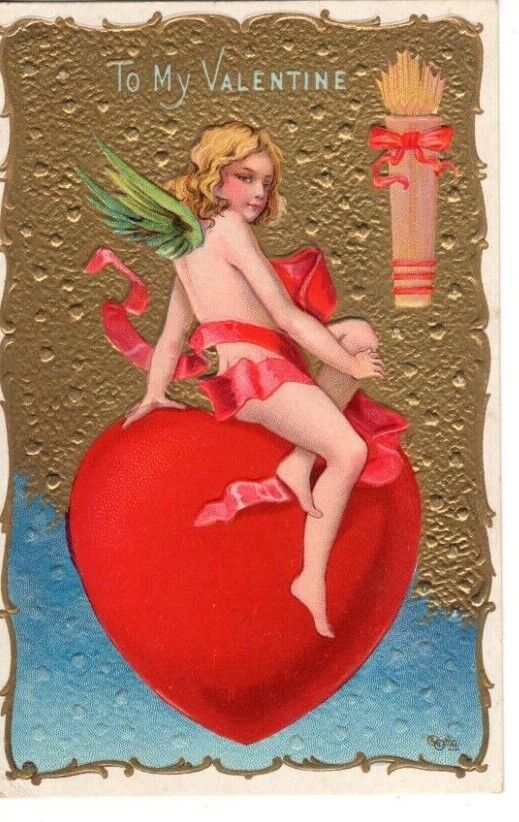 Title (ebay affiliate link): ANTIQUE EMBOSSED VALENTINE Postcard CUPID RED DRAPE SITTING ON HEART