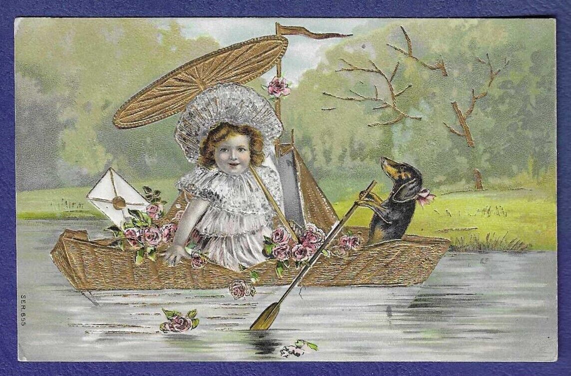 Title (ebay affiliate link): Antique 34girl dog in boat34 gold gilt SB Ser. 655 postcard used 1909