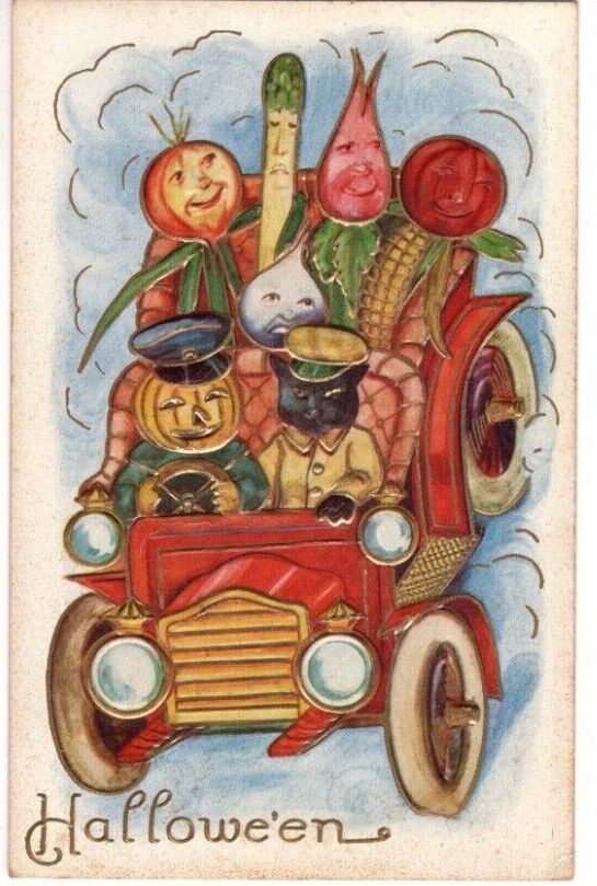 Title (ebay affiliate link): ANTIQUE EMBOSSED HALLOWEEN Postcard PUMPKIN MAN DRIVING LIVE VEGETABLES IN AUTO