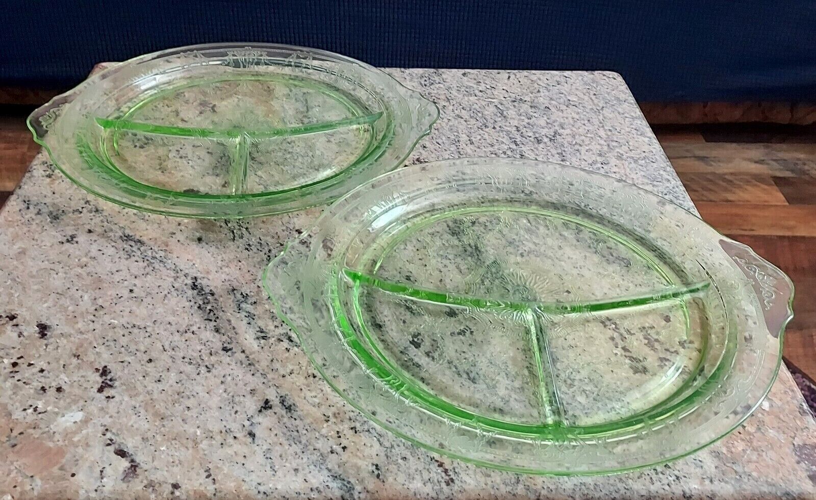 Two Vintage Anchor Hocking Green Depression Glass Cameo Ballerina Grill Plates