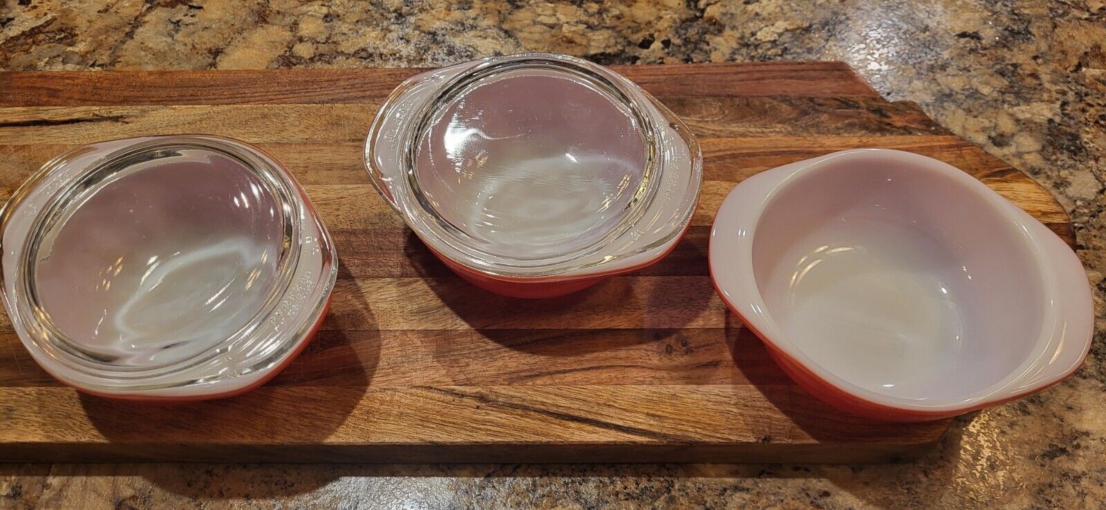 3 Vintage Pyrex 080 Small Dish 8oz FLAMINGO PINK? Glass Bakeware Round Casserole
