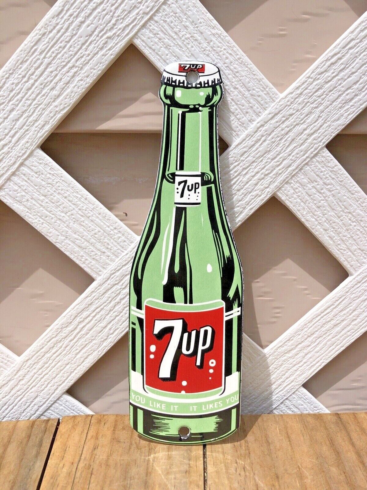 Title (ebay affiliate link): VINTAGE 7 UP BOTTLE CUTOUT OIL GAS SODA POP PORCELAIN SIGN PEPSI COCACOLA