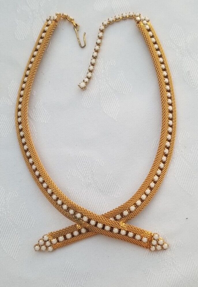 Title (ebay affiliate link): VTG Mesh GOLD GILT milkglass RHINESTONE snake style Choker STATEMENT NECKLACE