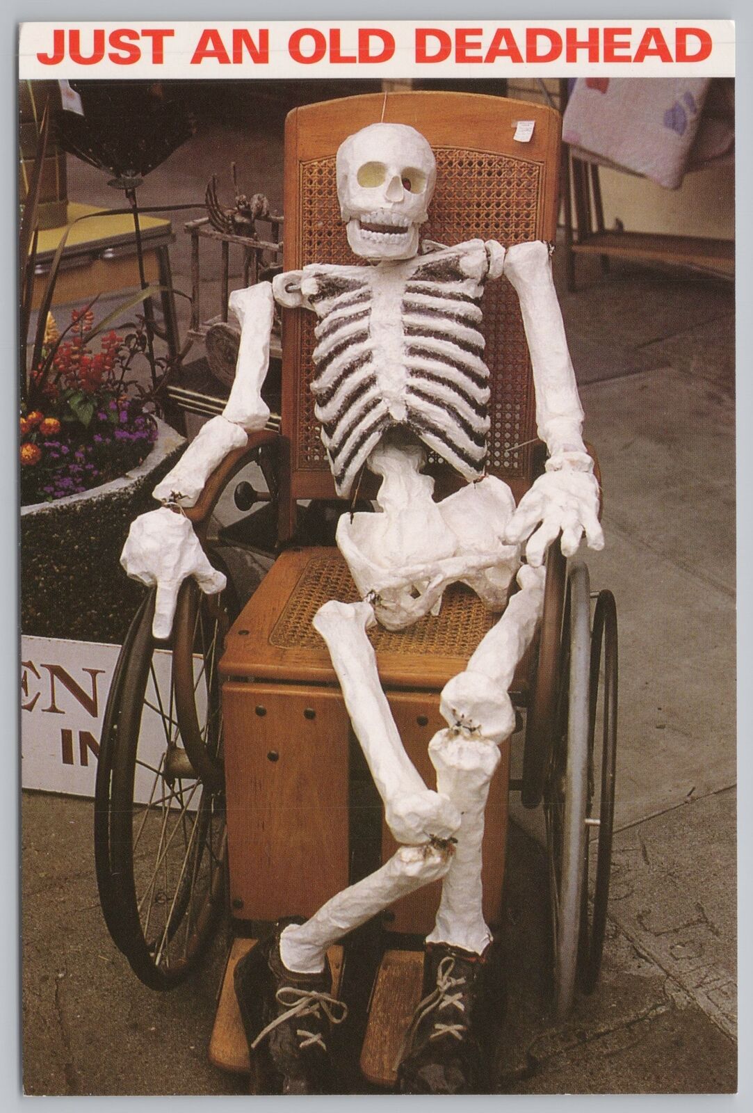 Title (ebay affiliate link): Just An Old DeadheadSkeleton in WheelchairAntiquesContinental Postcard