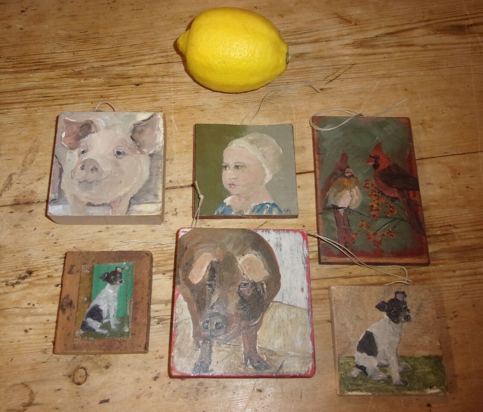 Title (ebay affiliate link): VINTAGE Miniature LOT Hand Paintings on WOOD TIN PIGS BIRDS DOGS