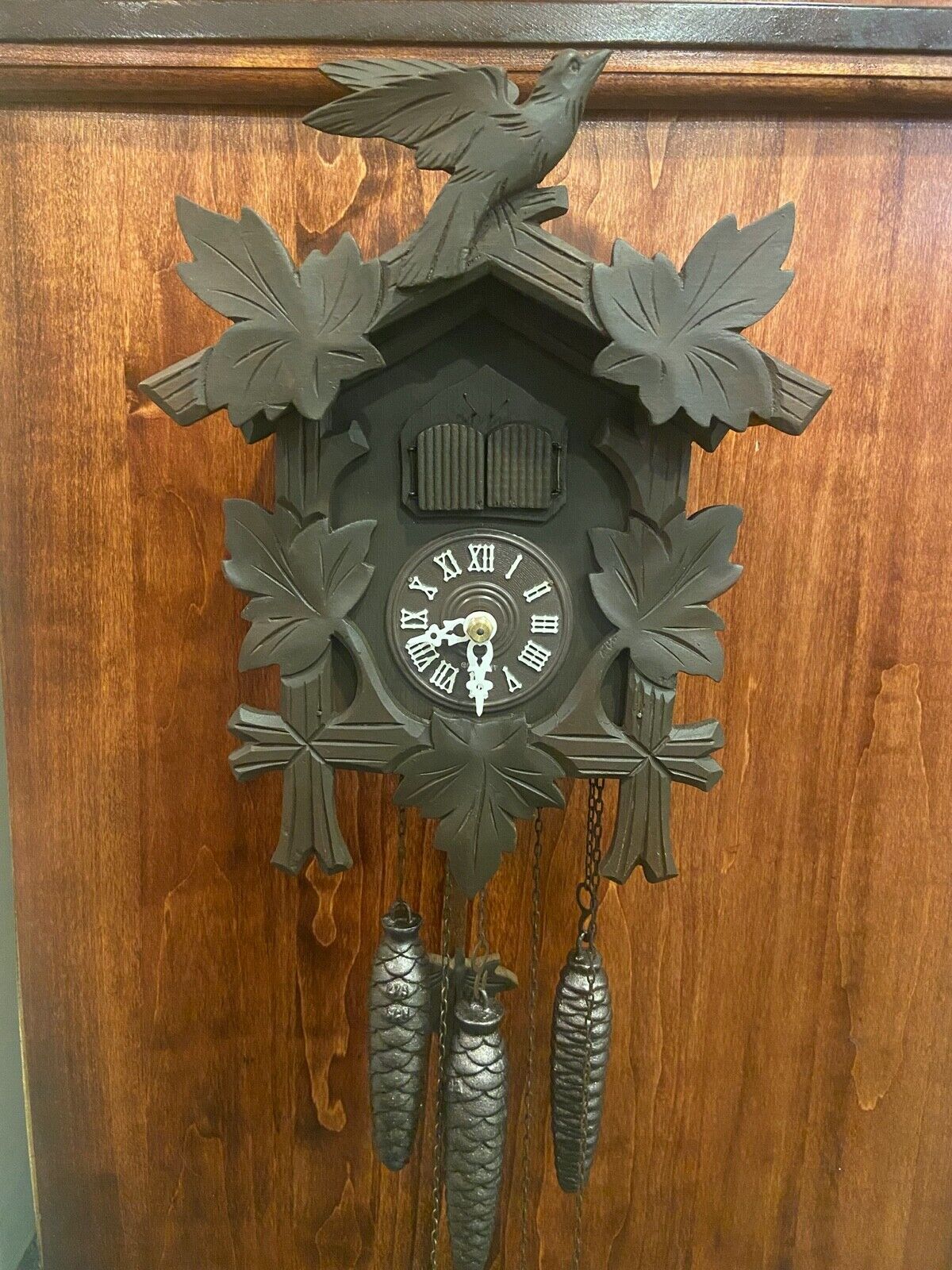 Title (ebay affiliate link): Vintage Authentic MUSICAL German Cuckoo Clock with Bird /Maple Leaf Topper