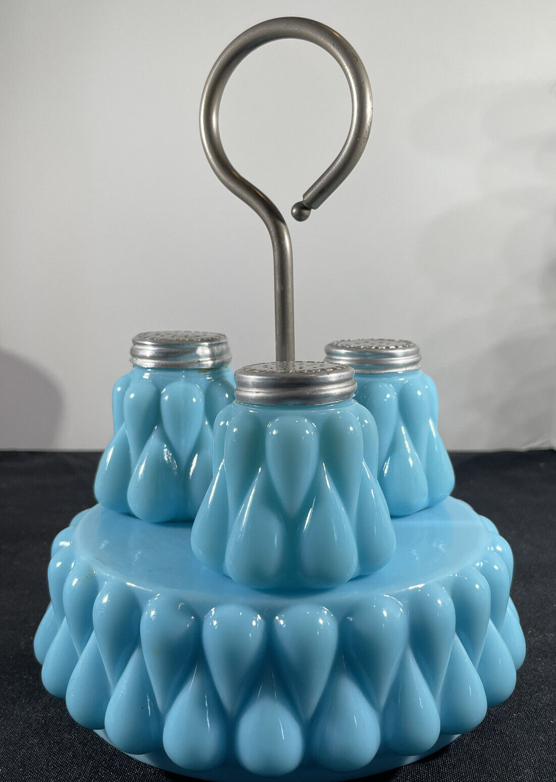 Title (ebay affiliate link): EAPG Bryce Higbee Co. 34Teardrop Row34 Blue Opaque Milk Condiment Set