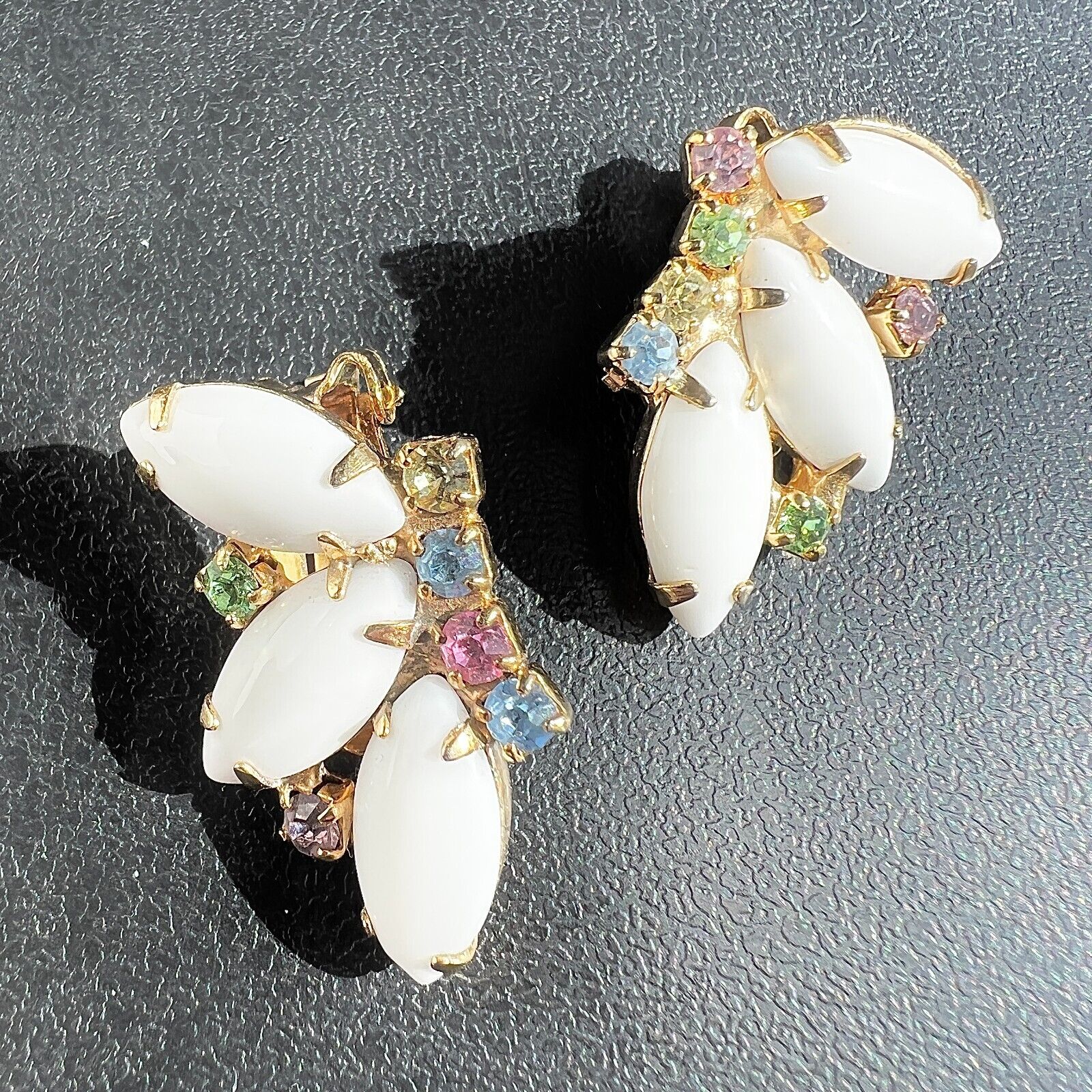 A661 Unsigned WEISS Vintage White Milk Glass Pastel Rhinestone Clip Earrings