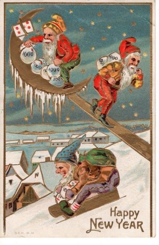 Title (ebay affiliate link): ANTIQUE EMBOSSED NEW YEAR Postcard GNOMES TAKING BAGS OF MONEY OFF MOON