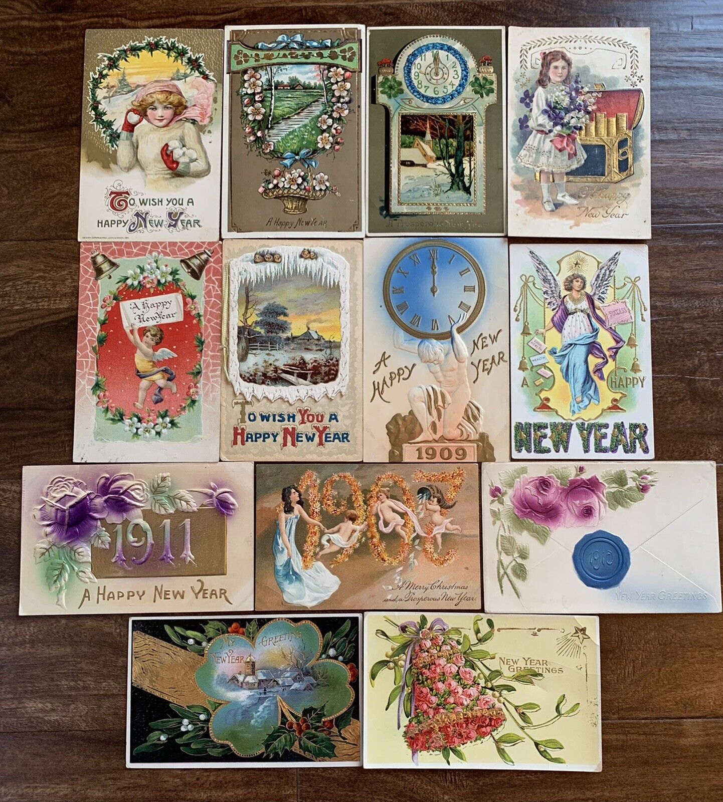 Antique Happy New Year Postcard Lot Of 13 Flowers Children Embossed Snow Winter