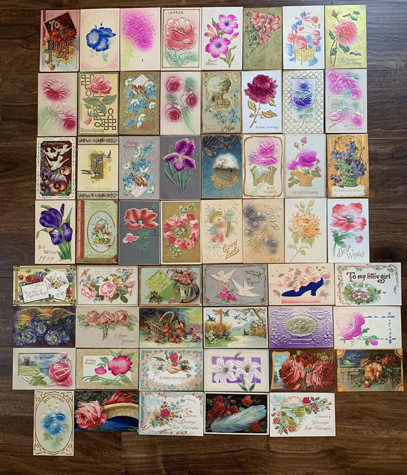 Antique Flower Postcard Lot Of 55 Happy Birthday Greetings Best Wishes Embossed