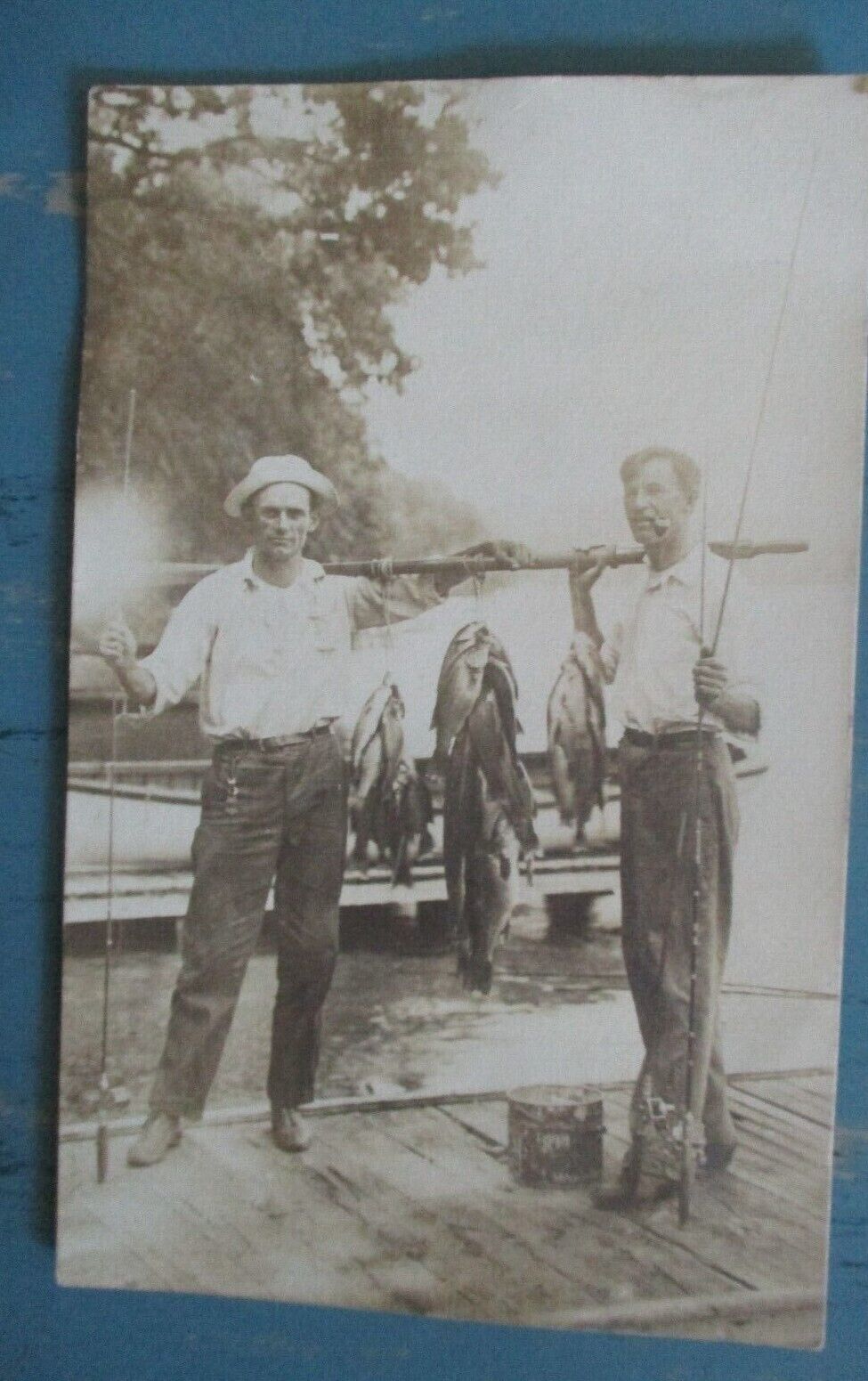 Antique Real Photo Postcard B W Two Men Fishing Big Catch unposted