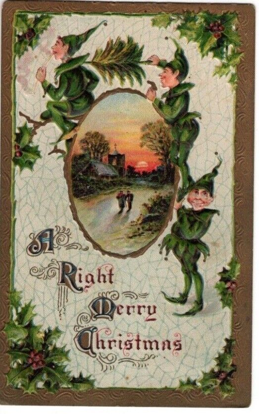 ANTIQUE EMBOSSED CHRISTMAS Postcard GNOMES CARRYING TREE BETWEEN THEM