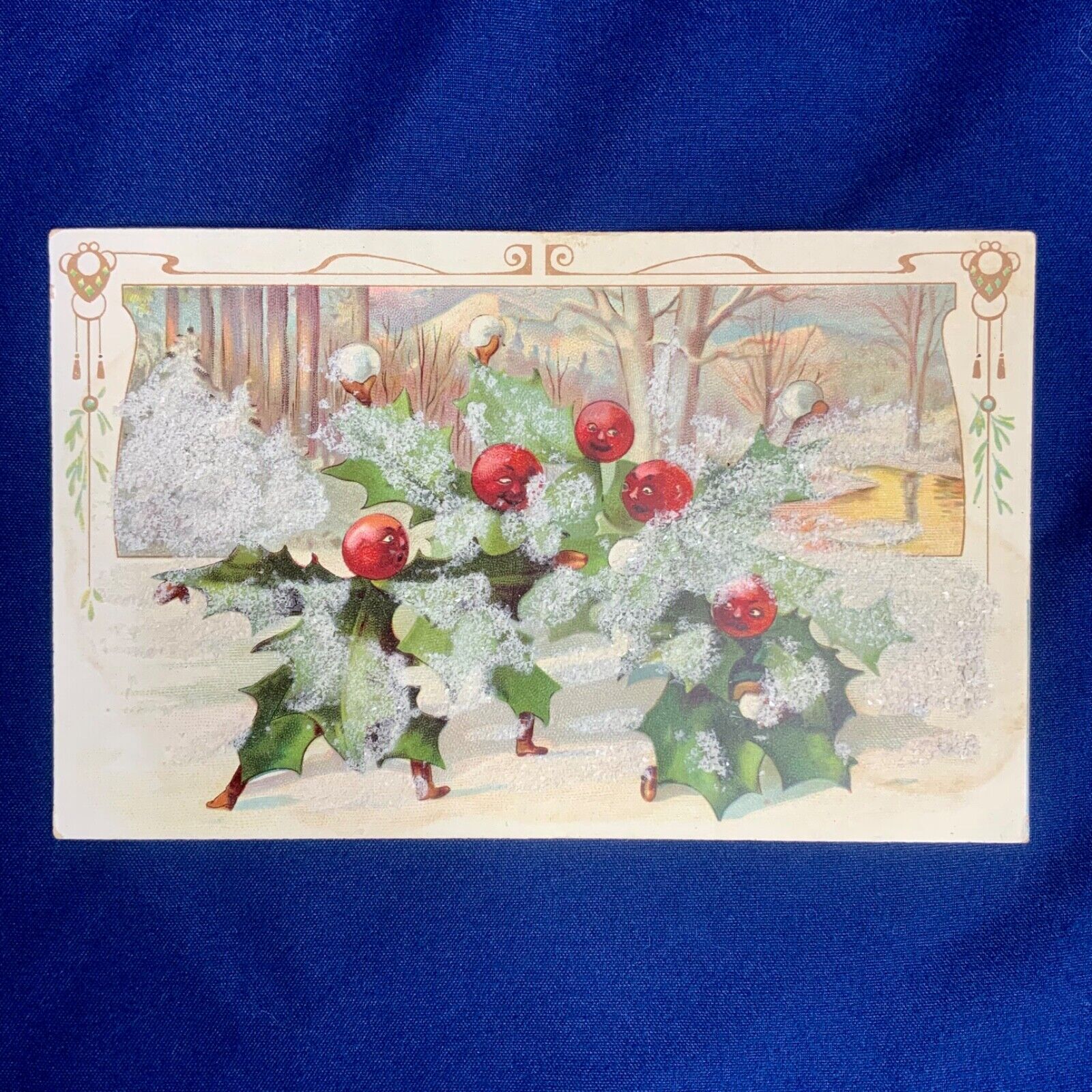 Title (ebay affiliate link): Antique Christmas Postcard Anthropomorphic Holly Leaves Berries Snowball Fight