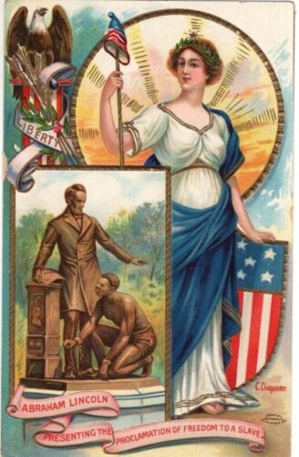 Title (ebay affiliate link): ANTIQUE PATRIOTIC Postcard LINCOLN PRESENTING THE PROCLAMATION OF FREEDOM