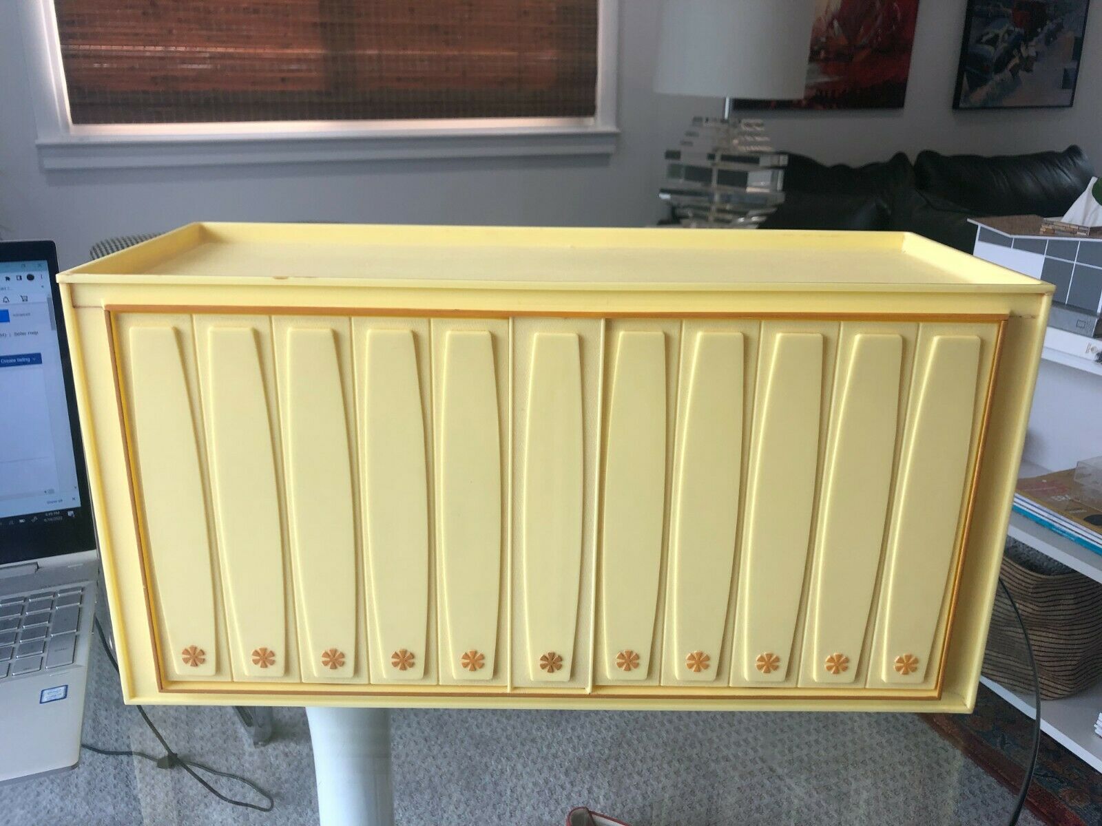 Title (ebay affiliate link): Rare Vintage Rubbermaid plastic Yellow Bathroom Vanity Cabinet Mid Century 1960s