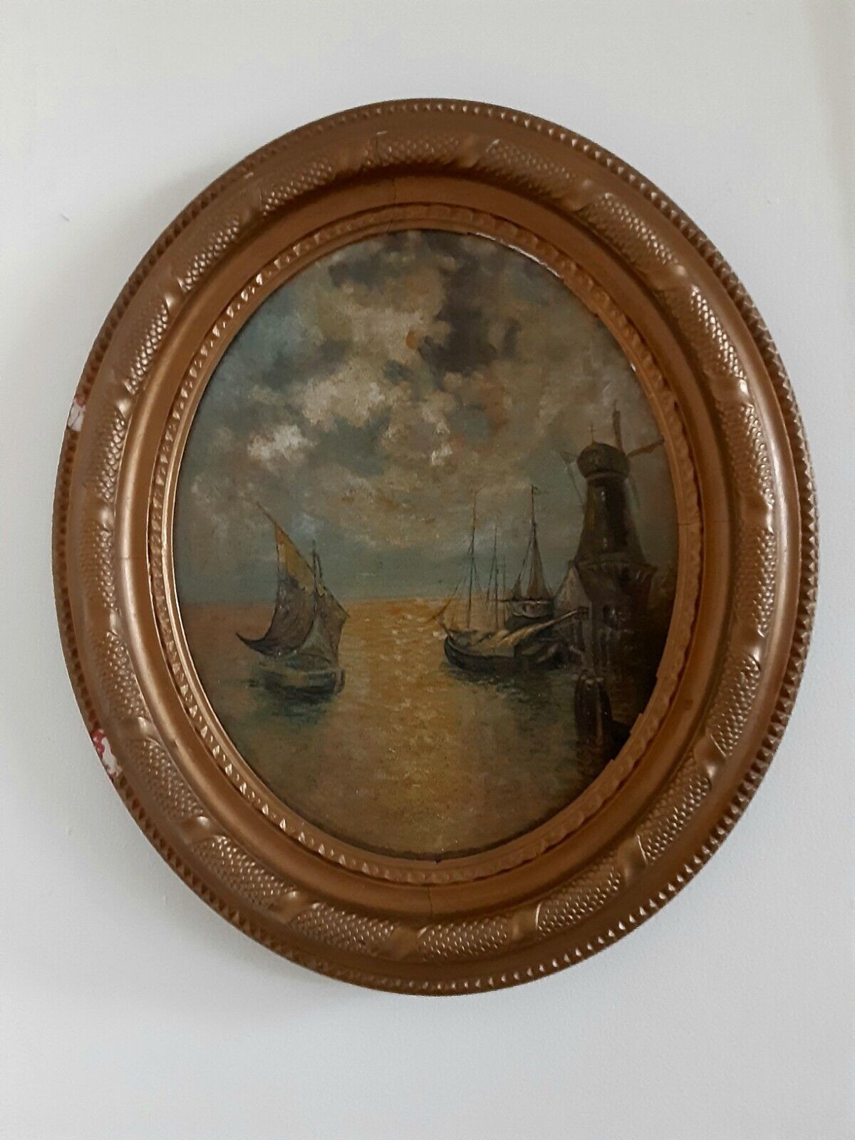 Title (ebay affiliate link): OLD ANTIQUE SEASCAPE OIL PAINTING SHIPS WINDMILL LOW LIGHT ART CANVAS SIGNED