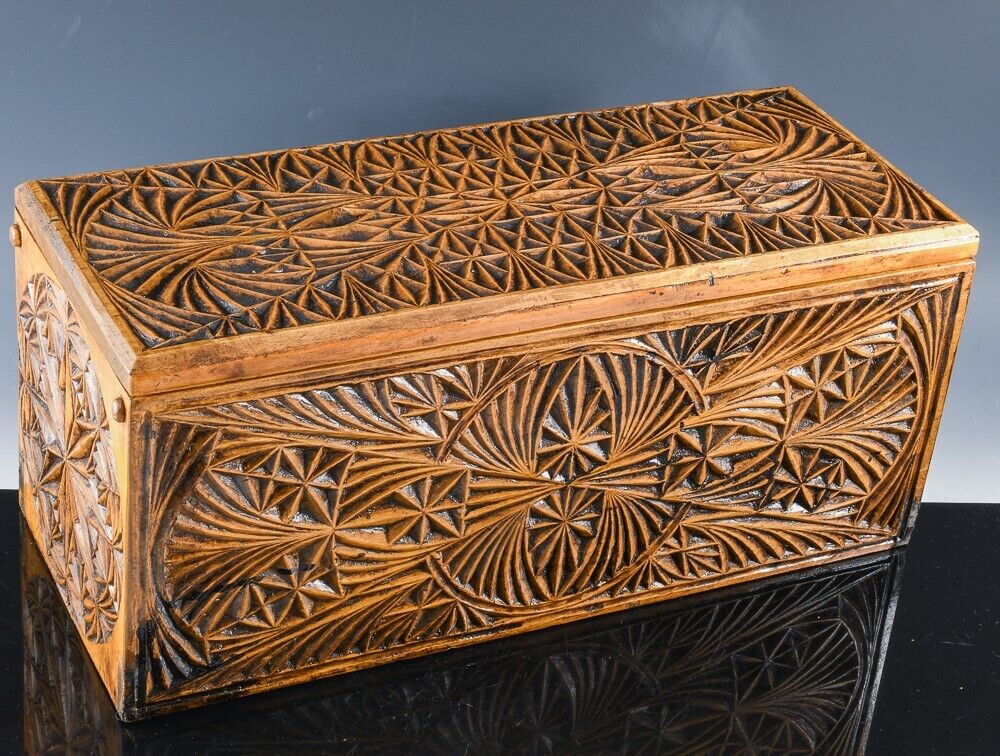 Title (ebay affiliate link): WONDRFUL LARGE OLDER TRAMP ART CHIP CARVED WOOD TABLE JEWELRY TREASURE CHEST BOX