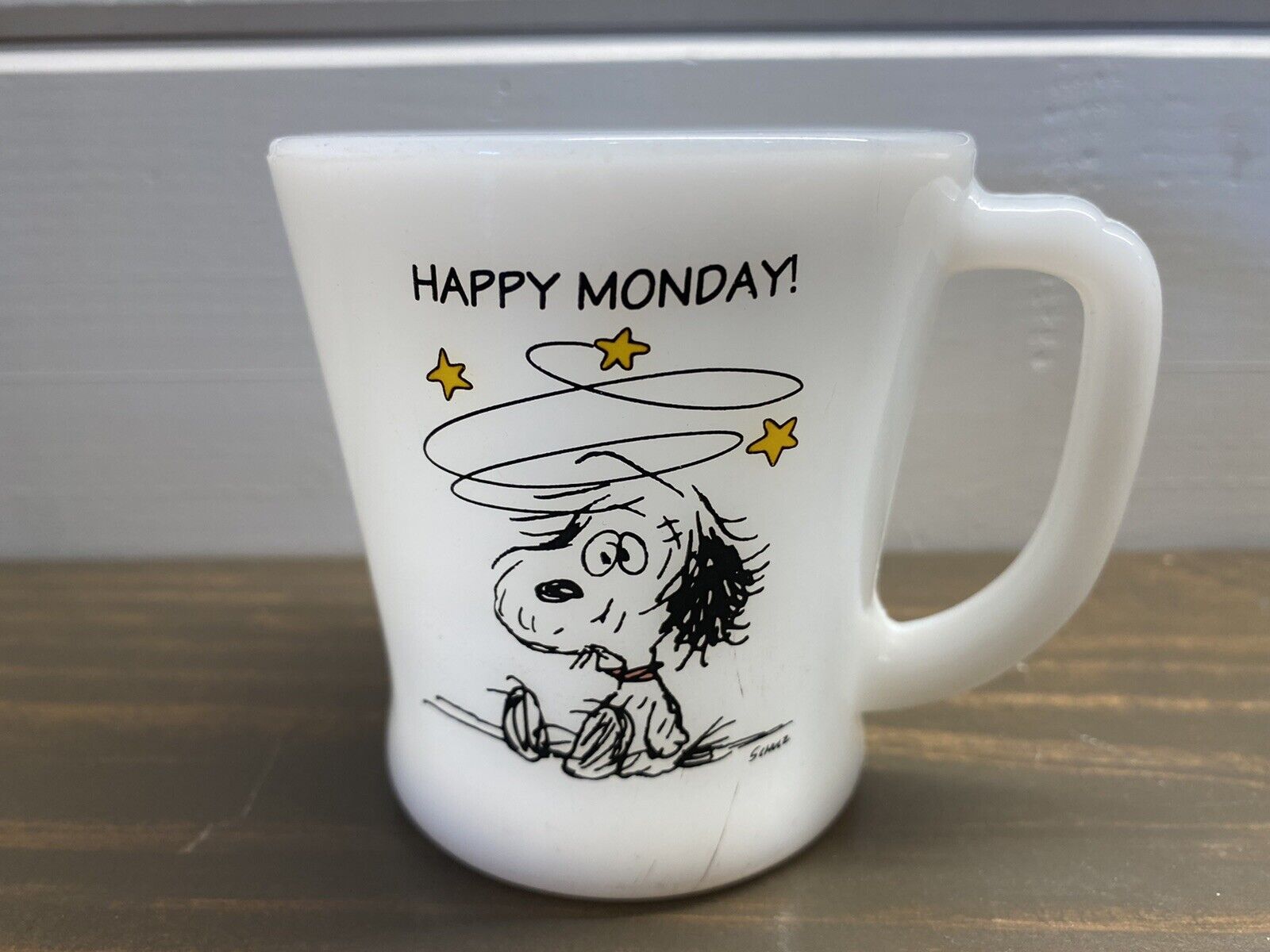 FireKing Anchor Hocking Peanuts Snoopy Happy Monday Milk Glass Coffee Mug Rare