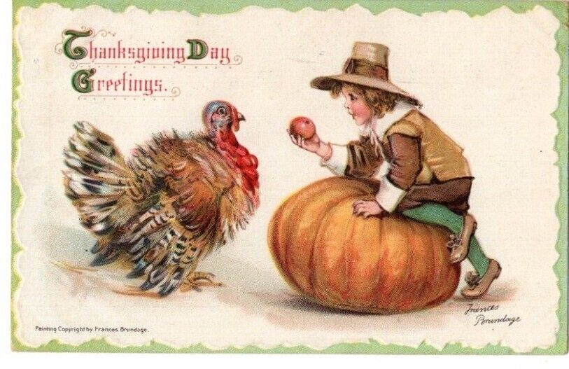Title (ebay affiliate link): ANTIQUE EMBOSSED THANKSGIVING Postcard FRANCES BRUNDAGE PILGRIM BOY APPLE