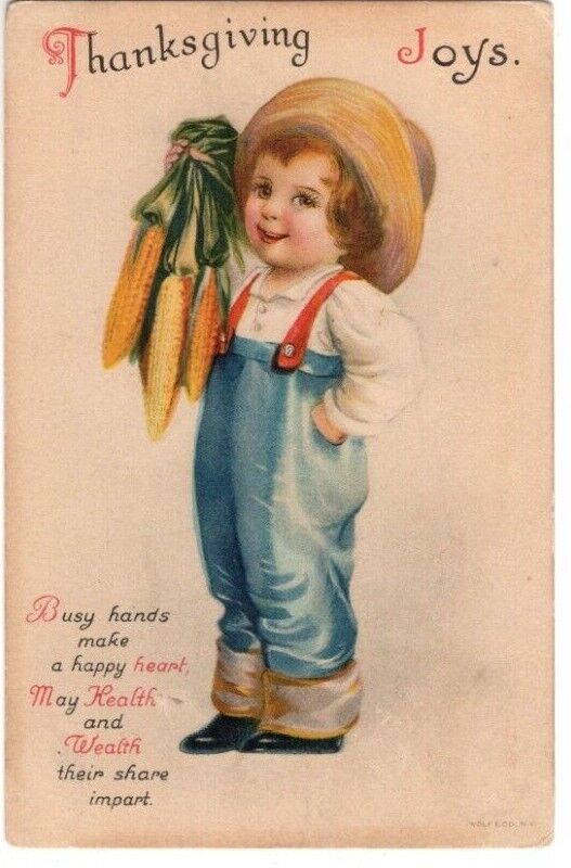 Title (ebay affiliate link): ANTIQUE THANKSGIVING Postcard YOUNG BOY STRAW HAT HOLDING EARS OF CORN