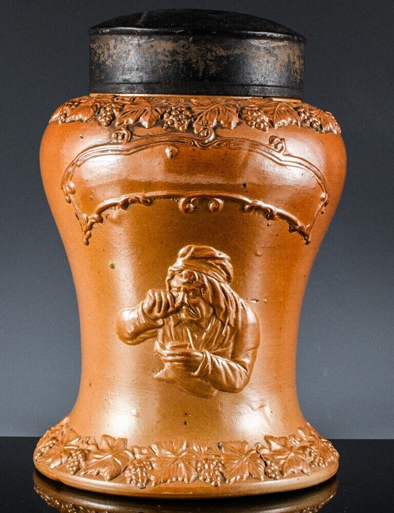 Title (ebay affiliate link): RARE c1820 GEORGIAN SALT GLAZE STONEWARE APOTHECARY FIGURAL SNUFF TOBACCO JAR