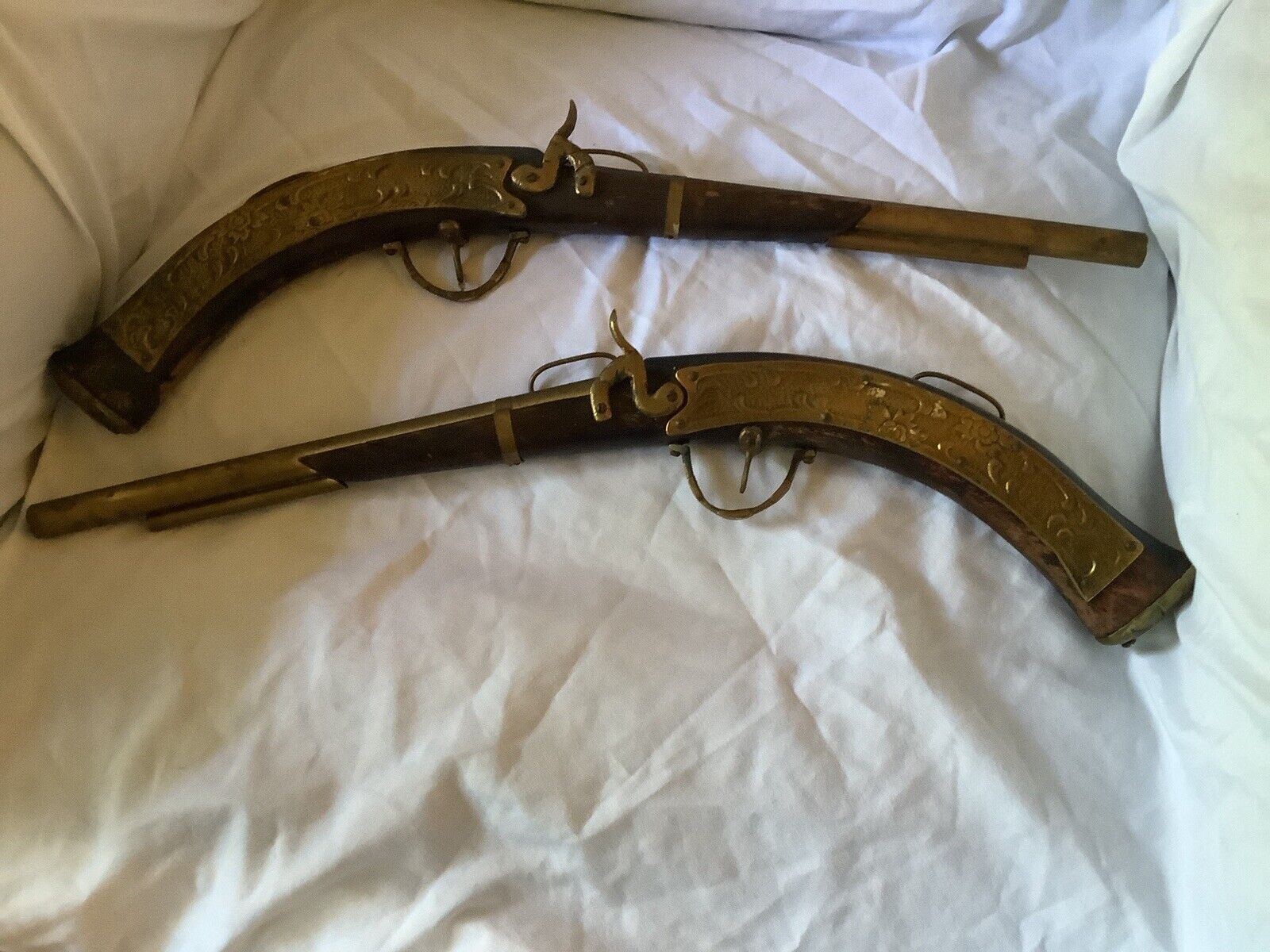 Pair Vintage English Brass / Wood Replica Pistol Wall Hanging Decor