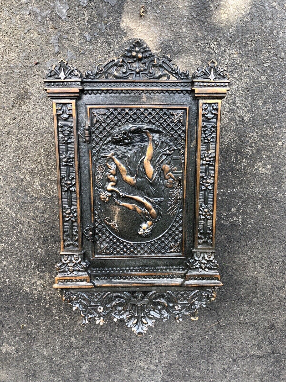 Antique Victorian Art Nouveau Ornate Iron Door Wooden Safe Medicine Cabinet