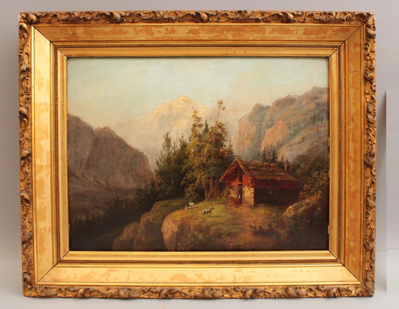 Title (ebay affiliate link): Antique Switzerland Swiss Alps Chalet Mountain Goats Landscape Oil Painting