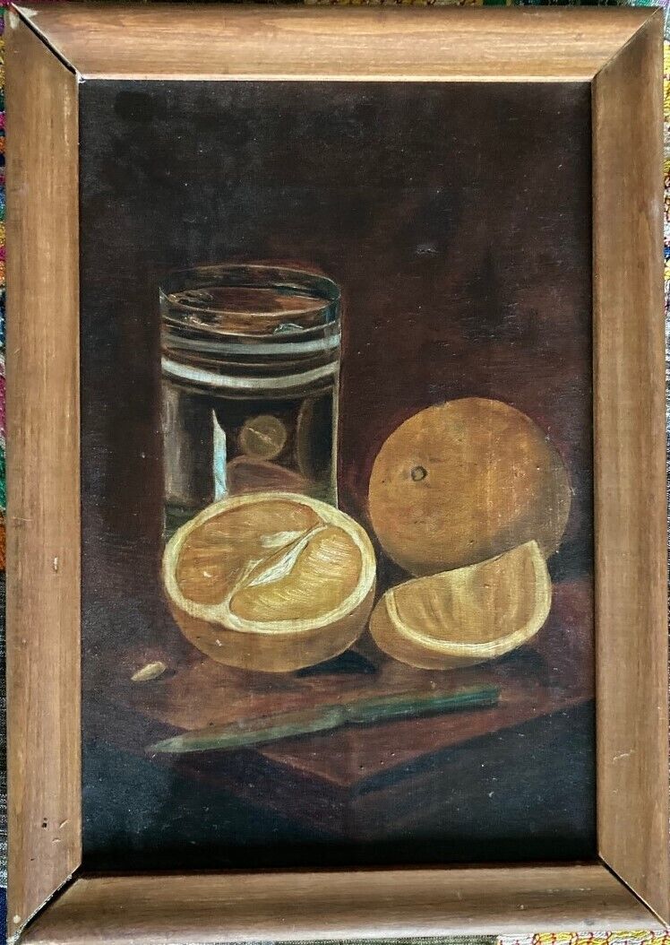 Good Small Antique Oil On Canvas Primitive StillLife With Oranges