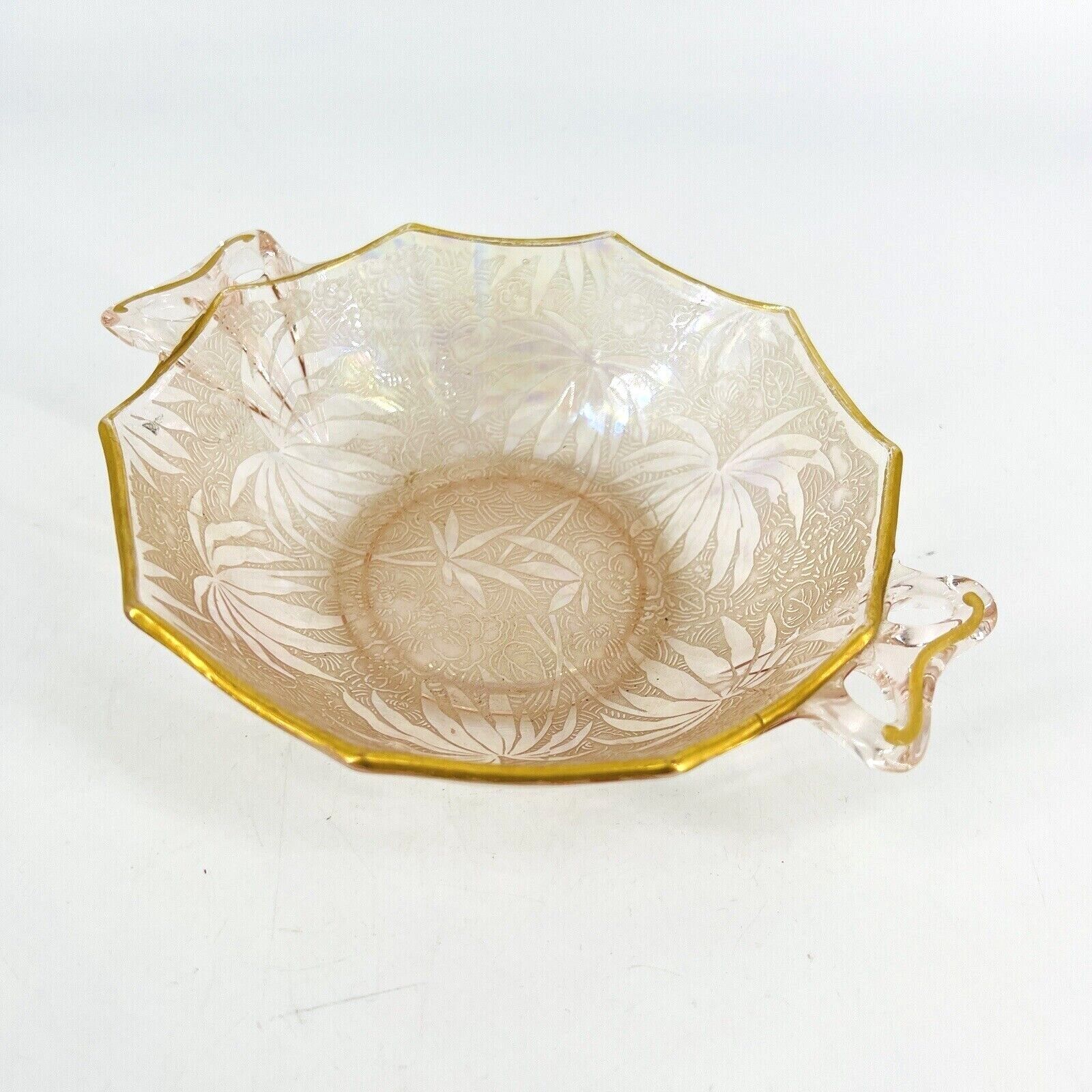 Vintage Fostoria Palm Brocade Etched Pink Gold Trim Glass Bowl Octagon