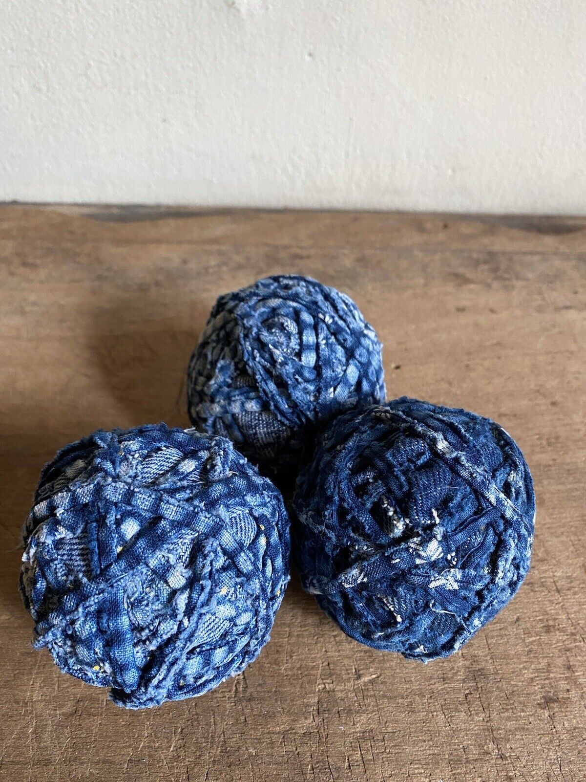 3 Old Artisan Made Antique Rag Rug Strip Balls Indigo Blue Textile AAFA