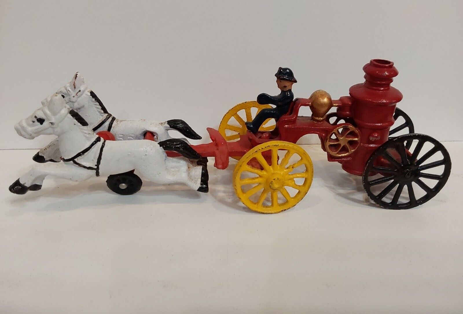 Title (ebay affiliate link): Vintage Antique Cast Iron Pumper Wagon 2 Horse Drawn Fire Truck Toy.